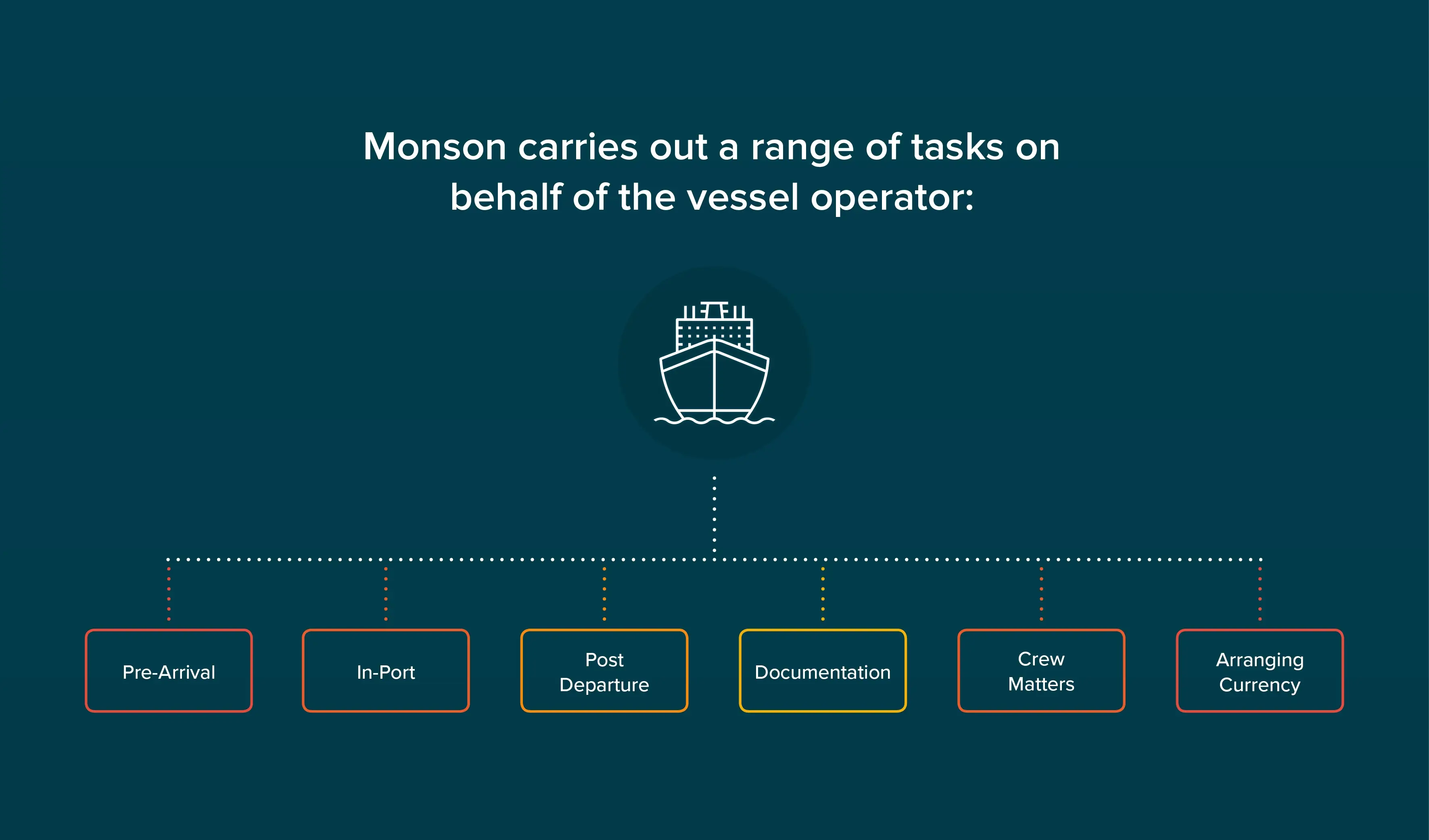 Monson carries out a long varied list of services for its vessel operator customers, the main ones are outlined in the diagram below: